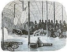 The king's private hut (ilawu) was located in one such triangular compartment and had three or four entrances.[6] His hut was very large and was kept very neat by attendants; it could easily accommodate 50 people. Modern archaeological excavations have revealed that the floor of this large hut was approximately 10 metres in diameter. Archaeologists found evidence inside the hut of 22 large supporting posts completely covered in glass beads.[5] These had been noted in historical accounts by Piet Retief, leader of the Voortrekkers, and the British missionaries Champion and Owen.