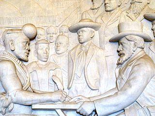 Dingane signing a treaty with Piet Retief, as depicted in the Voortrekker Monument