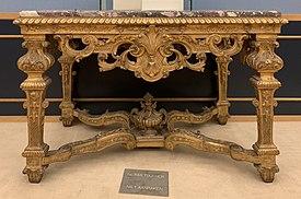 Tables can be freestanding or designed for placement against a wall. Tables designed to be placed against a wall are known as Pier tables[7] or console tables (French: console, "support bracket") and may be bracket-mounted (traditionally), like a shelf, or have legs, which sometimes imitate the look of a bracket-mounted table.