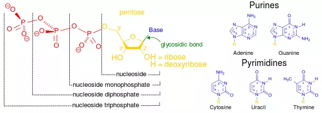 Structural elements of three nucleotides—where one-, two- or three-phosphates are attached to the nucleoside (in yellow, blue, green) at center: 1st, the nucleotide termed as a nucleoside monophosphate is formed by adding a phosphate (in red); 2nd, adding a second phosphate forms a nucleoside diphosphate; 3rd, adding a third phosphate results in a nucleoside triphosphate. + The nitrogenous base (nucleobase) is indicated by "Base" and "glycosidic bond" (sugar bond). All five primary, or canonical, bases—the purines and pyrimidines—are sketched at right (in blue).