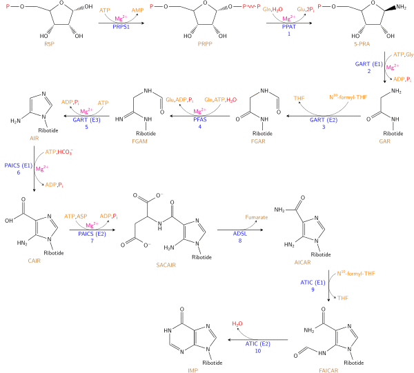 The synthesis of IMP. The color scheme is as follows: enzymes, coenzymes, substrate names, metal ions, inorganic molecules