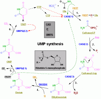 5. ^ Jones ME (1980). "Pyrimidine nucleotide biosynthesis in animals: genes, enzymes, and regulation of UMP biosynthesis". Annual Review of Biochemistry. 49 (1): 253–79. doi:10.1146/annurev.bi.49.070180.001345. PMID 6105839.
