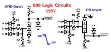 Up until 1952, IBM manufactured transistors by modifying off-the-shelf germanium diodes, after which they had their own alloy-junction transistor manufacturing plant at Poughkeepsie.[3][4] In the mid 1950s diode logic was used in the IBM 608 which was the first all-transistorized computer in the world. The image on the right shows two basic logic circuits used on 608 cards. A single card would hold four two-way circuits or three three-way or one eight-way. All input and output signals were compatible. The circuits were capable of reliably switching pulses as narrow as one microsecond.