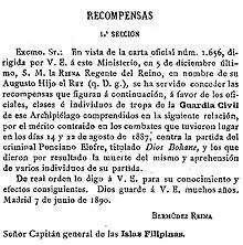 The activities of Elofre so alarmed the Spanish colonial government that Governor-General Valeriano Weyler sent 500 men of the Guardia Civil and a battleship to Negros to deal with the threat.[5] On August 22, 1887, Elofre raided Siaton, the town adjoining Zamboanguita, and was killed in the encounter with colonial forces. His wife, Flaviana Tubigan, continued the revolt, but lacked her husband's charm and charisma. She was succeeded by Ka Martin de la Cruz, of Tolong in southern Negros Oriental, Elofre's lieutenant, but his command of the babaylanes degenerated into banditry. When the Spanish authorities failed in their bid to capture him, on September 11, 1893, de la Cruz was killed in a trap laid by his own mistress, Alfonsa Alaidan.
