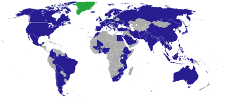 This is a list of diplomatic missions of Denmark. Kingdom of Denmark as a sovereign state consists of three countries incorporated in to the unity of the Realm (Denmark (proper), Greenland, Faroe Islands) and maintains 73 embassies abroad.[1] In countries where there is no Danish mission, according to the Helsinki Treaty, public officials in the foreign services of any of the Nordic countries are to assist citizens of another Nordic country if that country is not represented in the territory concerned.[2]