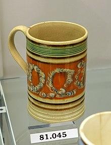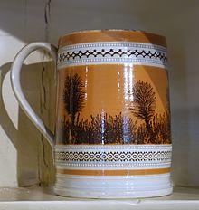 Dipped ware is the period term used by potters in late 18th- and 19th-century British potteries for utilitarian earthenware vessels turned on horizontal lathes and decorated with coloured slip; they are thus a type of slipware. The earliest examples have either variegated surfaces or geometric patterns created with the use of a rose and crown engine-turning lathe. By the 1790s mocha decoration began to be used, consisting of dendritic (branching) patterns formed by the reaction of the introduction of an acidic coloring agent to the alkalinity of the wet slip surface. Further decorative motifs were developed in the early 19th century, including common cable, called "earthworm" by collectors, as well as "cat's eyes", "dipped fan", and "twig", all collector terms as no surviving period documents have revealed the terminology used by the manufacturers for such motifs. Much of the factory output was intended for export, with large quantities shipped to North America where bowls, mugs, jugs, and other useful forms were used in households and taverns.