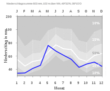 Given the prevailing southwest and west winds, Dirmstein's location alee of the Palatinate Forest means that the locality must make do with at most 500 mm of precipitation yearly. Moreover, in weather out of the northwest, the massif of the Donnersberg, lying 25 km away in the North Palatine Highland and rising to 689 m, often likewise hinders any abundance of precipitation. Dirmstein falls into the lowest fourth of the precipitation chart for all Germany. Only at 22% of the German Weather Service's weather stations are even lower figures recorded. The driest month is January. The most rainfall comes in May. In that month, precipitation is 2.2 times what it is in January. Precipitation varies markedly by month.