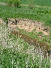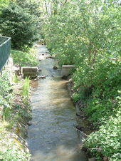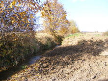 The in itself unimposing river Floßbach, coming from Obersülzen and also known locally as the Landgraben, which flows round Dirmstein in the north and on the village's eastern outskirts empties into the Eckbach from the left, was in the latter half of the 20th century straightened. The loss of flooding areas thus wrought, together with the increased speed of flow, brought about problems in times of heavy rainfall for the Nördlich der Heuchelheimer Straße ("North of Heuchelheim Road") construction site opened in the 1980s. In 1994 came widespread flooding for the first time, in which basements were filled with water up to their upper edges. In 2006, various versions of a plan to create flooding areas were brought forth for discussion. In 2008, Grünstadt-Land Verbandsgemeinde council decided to renaturate the brook over a stretch of a good kilometre. As an ecologically worthy measure, it was subsidized by the state of Rhineland-Palatinate to a share of 90% of the cost within the framework of its Aktion Blau.[5] In October 2008, the conversion began, in which former cropland along the brook, which through Flurbereinigung had been transferred to the municipality's ownership, was removed so that the brook could broaden out to the sides in heavy rains. To reduce the speed of flow, meanders were built back in and, of particular importance, two almost right-angled bends were smoothed out. With the planting of typical local trees and shrubs, the renaturation was completed in early 2009.[6]