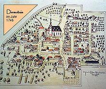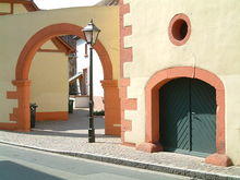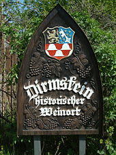 In the 8th century, Dirmstein had its first documentary mention, although this was undated. The first dated documentary mention came in 842. Although it never belonged to the Counts of Leiningen, it is today counted as part of the Leiningerland, the name used for those noblemen's old domain. The historical and well restored village centre has been raised to a monumental zone by the monument protection authority.[2] Of the 58 protected objects,[3] 48 lie within this zone. With few exceptions, they go back, like the village's foremost landmark, the Baroque simultaneous church St. Laurentius (Saint Lawrence's), to the municipality's heyday in the 18th century, towards the end of which Dirmstein apparently held town rights for two decades, although some sources are disputed.[4]