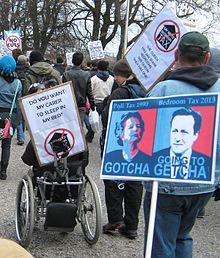 Following the introduction of the Bedroom Tax (officially the Under-occupancy penalty) in the Welfare Reform Act 2012, disability activists have played a significant role in the development of Bedroom Tax protests.[27] A wide range of benefit changes are estimated to affect disabled people disproportionately and to compromise disabled people's right to independent living.[28]