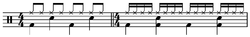 Songs often use syncopation, which is the accenting of unexpected beats. In general, the difference between a disco, or any dance song, and a rock or popular song is that in dance music the bass drum hits four to the floor, at least once a beat (which in 4/4 time is 4 beats per measure), whereas in rock the bass hits on one and three and lets the snare take the lead on two and four (the "backbeat"). Disco is further characterized by a 16th note division of the quarter notes as shown in the second drum pattern below, after a typical rock drum pattern.