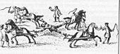 According to Olfert Dapper, a 17th-century Dutchman who meticulously collected reports from faraway countries from seamen and other travelers, a fairly frequent maritime death penalty among the corsairs on the Barbary coast was to affix the hands and feet to chains on four different ships. When the ships then sailed off in different directions, the chains grew taut, and the man in between was torn apart after a while.[22]