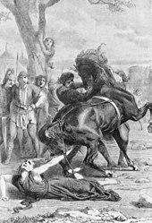 Queen Brunhilda of Austrasia, executed in 613, is generally regarded to have suffered the same death, though one account has it that she was tied to the tail of a single horse and thus suffered more of a dragging death. The Liber Historiae Francorum, an eighth century chronicle, describes her death by dismemberment as follows:[19]