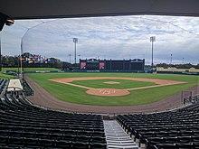 A 7,500 seat baseball stadium built in 1997 also has 2,000 more lawn seating. One of the original components of Wide World of Sports, it was formerly known as Cracker Jack Stadium and The Ballpark at Disney's Wide World of Sports. It was the spring training home of the Atlanta Braves from 1997 to 2019, and the recurring home for the Gulf Coast Braves. The Braves initially announced that 2017 would be their final year in the complex, but their departure would be delayed to 2019.[34] In 2020, the Atlanta Braves officially moved their spring training site to CoolToday Park located in North Port, FL after 21 years in the ESPN complex.[35] The stadium has hosted two regular season Major League Baseball series in 2007 and 2008 featuring the Tampa Bay Rays as the home team.[36] It is sponsored by Hanes with their Champion brand.