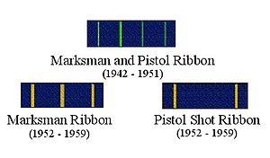 In 1952, the Secretary of the Navy ordered that the Distinguished Marksman and Pistol Shot Ribbon be divided into two new awards: the Distinguished Marksman Ribbon, to denote distinguished marksmanship with a rifle, and the Distinguished Pistol Shot Ribbon, to denote distinguished marksmanship with a pistol.[1] The Distinguished Marksman Ribbon and Distinguished Pistol Shot Ribbon were discontinued by the Navy Department in 1960.[1]
