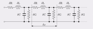 Transmission lines are a common example of the use of the distributed model. Its use is dictated because the length of the line will usually be many wavelengths of the circuit's operating frequency. Even for the low frequencies used on power transmission lines, one tenth of a wavelength is still only about 500 kilometres at 60 Hz. Transmission lines are usually represented in terms of the primary line constants as shown in figure 1. From this model the behaviour of the circuit is described by the secondary line constants which can be calculated from the primary ones.