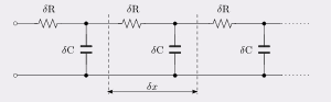 Another example of the use of distributed elements is in the modelling of the base region of a bipolar junction transistor at high frequencies. The analysis of charge carriers crossing the base region is not accurate when the base region is simply treated as a lumped element. A more successful model is a simplified transmission line model which includes distributed bulk resistance of the base material and distributed capacitance to the substrate. This model is represented in figure 2.