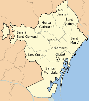 Barcelona, Catalonia, Spain is divided into 10 districts. These are administrated by a councillor designated by the main city council, and each of them have some powers relating to issues such as urbanism or infrastructure in their area. The current division of the city into different districts was approved in 1984.[1] In 2009, in Barcelona started using a new division of 73 neighbourhoods (the 10 districts are still in use), a division that was done for a better service from the City Council.[1]
