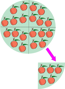 The simplest way of viewing division is in terms of quotition and partition: from the quotition perspective, 20 / 5 means the number of 5s that must be added to get 20. In terms of partition, 20 / 5 means the size of each of 5 parts into which a set of size 20 is divided. For example, 20 apples divide into five groups of four apples, meaning that twenty divided by five is equal to four. This is denoted as 20 / 5 = 4, or 20/5 = 4.[3] What is being divided is called the dividend, which is divided by the divisor, and the result is called the quotient. In the example, 20 is the dividend, 5 is the divisor, and 4 is the quotient.