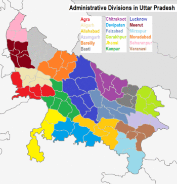 The northern Indian state of Uttar Pradesh, which borders Nepal, comprises 18 administrative divisions. Within these 18 divisions, there are a total of 75 districts. The following table shows the name of each division, its administrative capital city, its constituent districts, and a map of its location.