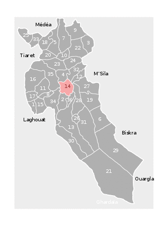 Djelfa (Arabic: ولاية الجلفة) is a province (wilaya) of Algeria. Its capital is Djelfa. It was first established by the administrative reorganization of 1974, and is home to over 1.2 million inhabitants. Localities in this province include , , .