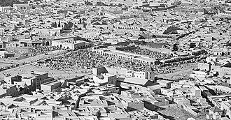 One specific explanation endorsed by modern historians[5][4][6] comes from historical reports that the powerful Saadian sultan Ahmad al-Mansur (ruled 1578-1603) had embarked on the construction of a monumental Friday mosque in the middle of the square. However, due to a downturn in fortunes (probably outbreaks of the plague) the sultan was forced to abandon the project part-way through and the mosque remained unfinished and fell into ruins. The ruined outline of its walls was apparently still visible in the 19th century and corresponded roughly to the current site of the "Souk Jdid" (the "new souk" just north of the food-stalls).[4] In this way, "jamaa al-fna' " ostensibly refers to the place of the "ruined mosque". The name "Jamaa al-Fna' " appears in historical records for the first time in the 17th-century chronicle of the West African historian Abderrahman as-Sa'idi. As-Sa'idi claimed that the intended name of al-Mansour's unfinished mosque was jamaa al-hna, meaning "Mosque of Tranquility", but that after its abandonment it came to be known, by popular irony, as the "Mosque of ruination/annihilation", or jamaa al-fana'.[5][4][7] (The word fana' in this case meaning a state of being extinguished or totally ruined, etc.)