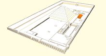 The funerary complex is the first architectural project to be built entirely out of stone. This complex had fourteen entrances but only one was functional. It is made up of the Great South Court, and the Heb-sed north court with Djoser's step pyramid in the center. The complex is enclosed by a 10.5 meters high stone wall, referred to as the enclosure wall. Along with the main courts there is a Roofed Colonnade Entrance located within the south court and a Serdab chamber that holds the seated statue of the king Djoser.[24]