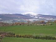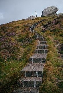 Djouce (/ˈdʒaʊs/; Irish: Dioghais, meaning "fortified height" [ˈdʲəuʃ])[2] at 725 metres (2,379 ft), is the 74th–highest peak in Ireland on the Arderin scale,[3] and the 91st–highest peak on the Vandeleur-Lynam scale.[4][5] Djouce is situated in the northeastern section of the Wicklow Mountains, and dominates the views of the Wicklow Mountains from Roundwood to Newtownmountkennedy.[2] Djouce is one of a few Irish mountains for which the Irish Office of Public Works (OPW) maintain a boarded mountain trail, using railway sleepers, from its base to a point close to its summit; making the mountain even more accessible to the public, but while also protecting the underlying bog and soil from human erosion.[1][6] Djouce is popular with hill walkers, and it lies along the 131-kilometre Wicklow Way; on its southern slopes at a senic viewpoint is the J.B. Malone memorial stone, dedicated to the creator of the Wicklow Way.