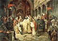 The neighboring Holy Roman Empire under Henry IV invaded Hungary in 1063 to restore Solomon to the throne. Hungary was then ruled by Béla I, whose third daughter Helen was married to Zvonimir. According to Chronicon Pictum, Croatia was also attacked around 1067 by the Carantanian army of Ulric I, who occupied a part of Kvarner and eastern coast of Istria, the March of Dalmatia.[9] Since the Croatian king was preoccupied with rebellion in Dalmatia, due to the prohibition of Slavic liturgy,[6] Zvonimir was compelled to seek protection from Solomon, King of Hungary instead. Géza I and Solomon helped Zvonimir in restoring authority in the March of Dalmatia. After they jointly repelled the Carantanians from Croatia,[10] Ban Zvonimir sent gifts to Solomon as a sign of gratitude.[11] Shortly afterwards in 1070 Zvonimir is first mentioned as a Ban of Croatia in charters from Zadar, succeeding Gojko.[9][12] Croatian charters at the time were issued in the names of both King Peter Krešimir and Ban Zvonimir.[13] At the beginning of 1075, Zvonimir held title as "Duke of Croatia"; this gave him the rule of northern Dalmatia, and made him chief adviser to the reigning king and his heir. In that same year, Normans from southern Italy, led by Count Amico of Giovinazzo, invaded Croatia and captured a certain Croatian king whose name is not mentioned, most likely King Peter Krešimir, who died soon after.[6] About the middle of 1075, Zvonimir regained the allegiance of the coastal cities of Dalmatia which had been lost to the Normans.[14] Meanwhile, another contender for the throne, Stephen Trpimirović, who had also been the Duke of Croatia, relinquished his claim and relocated to the Church of Saint Stephen beneath the pines in the vicinity of Split, where he was to live a secluded life. This opened Zvonimir's path to the throne, with support from Pope Gregory VII.