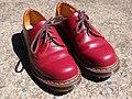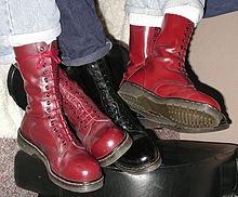 The first Dr. Martens boots in the United Kingdom, with an eight-eyelet cherry red coloured smooth leather design known as style 1460 and still in production today, although in many variations, were introduced on 1 April 1960. The three-eyelet shoe arrived exactly one year later with the style number 1461 (1/4/61). Dr. Martens boots were made in their Cobbs Lane factory in Wollaston, Northamptonshire, where they continued to be made, in addition to production elsewhere, until at least 2018.[5][7] In addition, a number of shoe manufacturers in the Northamptonshire area and further afield produced the boots under licence, as long as they passed quality standards. The boots were popular among workers such as postmen, police officers and factory workers. By the later 1960s, skinheads started to wear them, "Docs" or "DMs" being the usual naming, and by the late 1970s, they were popular among scooter riders, punks, some new wave musicians, and members of other youth subcultures.[8] The shoes' popularity among politically right-wing skinheads led to the brand gaining an association with violence.[8] Alexei Sayle sang the song "Dr. Martens' Boots" in a 1982 episode of the British TV comedy The Young Ones.[9]