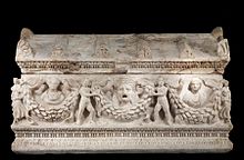 Strabo places Docimium somewhere about Synnada: he calls it a village, and says that there is there a quarry of Synnadic stone,[4] as the Romans call it, but the people of the country call it Docimites and Docimaea; the quarry at first yielded only small pieces of the stone, but owing to the later efforts of the Romans large columns of one piece are taken out, which in variety come near the Alabastrites, so that, though the transport to the sea of such weights is troublesome, still both columns and slabs were brought to Rome of wondrous size and beauty. The red colors which streaked the white marble taken from the city's holy mountain were attributed to the drops of blood from the dying god Attis.[5] The word Docimaea (Δοκιμαίαν) in this passage of Strabo appears to be corrupt. It should be either Δοκιμαῖον or Δοκιμέα.