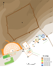 In c. 290 BCE, King Pyrrhus made Dodona the religious capital of his domain and beautified it by implementing a series of construction projects (i.e. grandly rebuilt the Temple of Zeus, developed many other buildings, added a festival featuring athletic games, musical contests, and drama enacted in a theatre).[17] A wall was built around the oracle itself and the holy tree, as well as temples to Dione and Heracles.