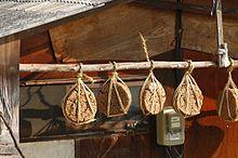 Meju, Korean soybean brick, is made around ipdong in early November. Soybeans are soaked overnight, boiled in salt water, and then pounded in a mortar (jeolgu) or coarsely ground in a millstone. About a doe (≈1.8 litres) or two does of pounded soybean is chunked, compressed, and shaped into a cube or a sphere called meju. The meju bricks are then dried in a cool, shaded area for a week to several weeks until firm. When the bricks harden, they are tied with rice straws to the eaves of the house, or put in the warm ondol room with rice straws, for fermentation. In Jeongwol, the first month of the lunar year, well-fermented meju bricks are washed and sun-dried.