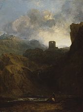 The remaining parts of the castle continued to be used as a manor house into the 14th century.[18] By the 18th century, however, Dolbadarn Castle was ruined and uninhabited.[19] From the 1760s onwards, however, it became a popular topic for painters interested in the then fashionable landscape styles of the Sublime and the Picturesque.[20] Typically the castle was painted in the middle ground, allowing the viewer's eye to contrast its ruined outline with the lakes and mountains of Snowdonia; frequently the landscape was misrepresented by the artist, to create a more striking or dramatic effect.[21] J. M. W. Turner's 1800 work Dolbadarn Castle depicted the back-lit castle looming over the landscape and became particularly famous, but the paintings of the castle by Richard Wilson and Paul Sandby also represent important artistic works of the period.[21]