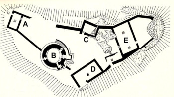 The rectangular west tower was a relatively short defensive structure, designed to protect the more vulnerable western slope of the ridge.[24] A similar tower in the south overlooks the entrance to the castle.[25] At the north end of the castle is the hall, stretching across the courtyard; in the east corner is an additional building, probably built by the English at the end of the 13th century.[29] Although the hall is relatively large, 50 by 27 feet (15 by 8 m), these buildings follow a simpler design to those current in England at the time, where a combination of a hall, chamber and a service block in castles was becoming more common.[30]