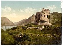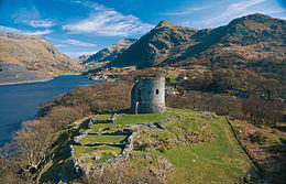 Dolbadarn Castle (English: /dɒlˈbædɑːn/; Welsh: Castell Dolbadarn Welsh pronunciation: [kastɛɬ dɔl'badaːn]) is a fortification built by the Welsh prince Llywelyn the Great during the early 13th century, at the base of the Llanberis Pass, in northern Wales. The castle was important both militarily and as a symbol of Llywelyn's power and authority. The castle features a large stone keep, which historian Richard Avent considers "the finest surviving example of a Welsh round tower".[1] In 1284 Dolbadarn was taken by Edward I, who removed some of its timbers to build his new castle at Caernarfon. The castle was used as a manor house for some years, before falling into ruin. In the 18th and 19th century it was a popular destination for painters interested in Sublime and Picturesque landscapes. It is now owned by Cadw and managed as a tourist attraction, and is protected as a grade I listed building.