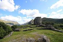 Dolbadarn Castle was built in either the 1220s or the 1230s by Llywelyn the Great, at the base of the Llanberis Pass, overlooking the lake of Llyn Padarn in northern Wales.[2] Traditionally the Welsh princes had not constructed castles, instead using undefended palaces called llysoedd, or courts.[3] From the late 11th century onwards, the Normans had advanced into Wales, taking lands in the north and establishing a band of occupied territory in the south called the Welsh Marches. During the 12th century some timber and earthwork castles began to be built, but in small numbers.[4]