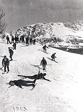 The Dolomites are renowned for skiing in the winter months and mountain climbing, hiking, cycling, and BASE jumping, as well as paragliding and hang gliding in summer and late spring/early autumn.[6][7] Free climbing has been a tradition in the Dolomites since 1887, when 17-year-old Georg Winkler soloed the first ascent of the pinnacle of the Vajolettürme.[8] The main centres include: Rocca Pietore alongside the Marmolada Glacier, which lies on the border of Trentino and Veneto, the small towns of Alleghe, Falcade, Auronzo, Cortina d'Ampezzo and the villages of Arabba, Urtijëi and San Martino di Castrozza, as well as the whole of the Fassa, Gardena and Badia valleys.[9]