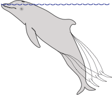 The term 'dolphin' can be used to refer to, under the parvorder Odontoceti, all the species in the family Delphinidae (oceanic dolphins) and the river dolphin families Iniidae (South American river dolphins), Pontoporiidae (La Plata dolphin), Lipotidae (Yangtze river dolphin) and Platanistidae (Ganges river dolphin and Indus river dolphin).[6][7] This term has often been misused in the US, mainly in the fishing industry, where all small cetaceans (dolphins and porpoises) are considered porpoises,[8] while the fish dorado is called dolphin fish.[9] In common usage the term 'whale' is used only for the larger cetacean species,[10] while the smaller ones with a beaked or longer nose are considered 'dolphins'.[11] The name 'dolphin' is used casually as a synonym for bottlenose dolphin, the most common and familiar species of dolphin.[12] There are six species of dolphins commonly thought of as whales, collectively known as blackfish: the killer whale, the melon-headed whale, the pygmy killer whale, the false killer whale, and the two species of pilot whales, all of which are classified under the family Delphinidae and qualify as dolphins.[13] Though the terms 'dolphin' and 'porpoise' are sometimes used interchangeably, porpoises are not considered dolphins and have different physical features such as a shorter beak and spade-shaped teeth; they also differ in their behavior. Porpoises belong to the family Phocoenidae and share a common ancestry with the Delphinidae.[12]