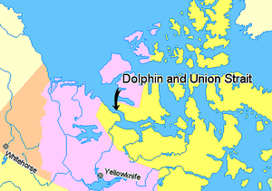 Dolphin and Union Strait lies in both the Northwest Territories (Inuvik Region) and Nunavut (Kitikmeot Region), Canada, between the mainland and Victoria Island. It links Amundsen Gulf, lying to the northwest, with Coronation Gulf, lying to the southeast. The southeastern end of the strait is marked by Austin Bay. It gets its name from the two boats used by John Richardson who first explored it in 1826.
