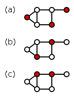 Figures (a)–(c) on the right show three examples of dominating sets for a graph. In each example, each white vertex is adjacent to at least one red vertex, and it is said that the white vertex is dominated by the red vertex. The domination number of this graph is 2: the examples (b) and (c) show that there is a dominating set with 2 vertices, and it can be checked that there is no dominating set with only 1 vertex for this graph.