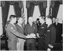 When that ship was severely damaged by Japanese air attack on March 19, 1945, Lieutenant Gary discovered 300 men trapped in a blackened mess compartment and, finding an exit, returned repeatedly to lead groups to safety. Gary later organized and led firefighting parties to battle the inferno on the hangar deck and entered number three fireroom to raise steam in one boiler, braving extreme hazards in so doing. For his heroism on that occasion, he was awarded the Medal of Honor on January 23, 1946.[1]