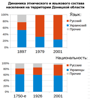 According to the 2001 census, ethnic Ukrainians form 58% of the population of Luhansk Oblast and 56.9% of Donetsk Oblast. Ethnic Russians form the largest minority, accounting for 39% and 38.2% of the two oblasts respectively.[50] Modern Donbass is a predominately Russophone region. According to the 2001 census, Russian is the main language of 74.9% of residents in Donetsk Oblast and 68.8% in Luhansk Oblast.[51] The proportion of native Russian-speakers is higher than ethnic Russians because some ethnic Ukrainians and other nationalities also indicate Russian as their mother tongue.
