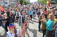 This strike was followed by a 1994 consultative referendum on various constitutional questions in Donetsk and Luhansk oblasts, held concurrently with the first parliamentary elections in independent Ukraine.[36] These questions included whether Russian should be enshrined as an official language of Ukraine, whether Russian should be the language of administration in Donetsk and Luhansk oblasts, whether Ukraine should federalise, and whether Ukraine should have closer ties with the Commonwealth of Independent States.[37] Close to 90% of voters voted in favour of these propositions.[38] None of them were adopted: Ukraine remained a unitary state, Ukrainian was retained as the sole official language, and the Donbass gained no autonomy.[34] Nevertheless, the Donbass strikers gained many economic concessions from Kyiv, allowing for an alleviation of the economic crisis in the region.[35]