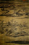 Detail from Xiao and Xiang Rivers, permanent collection at the Palace Museum. This painting is often considered to be one of Dong Yuan's greatest masterpieces, and it "illustrates the revolutionary impressionism" he had achieved by "means of broken ink washes and the elimination of the outline."[1] | |