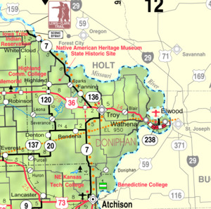 The only major highway serving the county is U.S. Highway 36, an east–west route traveling through St. Joseph. Troy, Elwood, and Wathena lie along this route. Kansas state highways K-7, K-20, K-120, K-136, K-137, and K-238 serve other areas of the county. K-7 has been designated a scenic byway. (See the map below.)