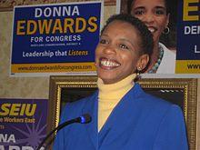 A lawyer and longtime community activist, she defeated 15-year incumbent Albert Wynn in the 2008 Democratic primary,[2] and, following his resignation, won a special election on June 17, 2008, to fill the remainder of this term.[3] She was sworn in two days later on June 19, becoming the first African-American woman to represent Maryland in the United States Congress.[4] Edwards ran for a full term in November 2008, defeating Republican candidate Peter James with 85% of the vote.[5] She ran for U.S. Senate in 2016 in the primary to replace retiring Barbara Mikulski instead of running for re-election to her Congressional seat, but was defeated by Chris Van Hollen in the Democratic primary.[6]