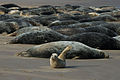 A 6 miles (10 km) coastal strip stretching from Saltfleet in the south, to Somercotes Haven in the north, is managed by the Lincolnshire Wildlife Trust as a nature reserve.[2] It is part of the land owned by the Ministry of Defence and used as a bombing range.[1] The grey seal population return to breed from October to December every year. From 2007, when about 1,194 pups were born to 3,500 resident grey seal colony, births rates have grown to 2,066 pups born over the 2018 season.[3] A double wooden fence was erected in 2007 to stop people touching the newborn pups.
