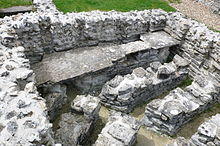 Other Roman remains include part of the town walls and the foundations of a town house near the county hall. Modern building works within the walls have unearthed Roman finds; in 1936 a cache of 22,000 3rd-century Roman coins was discovered in South Street.[6]