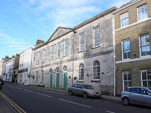 Max Gate was designed by Thomas Hardy in the Queen Anne style, and was his home until his death in 1928. It was built in 1885.[77] The remains of the Roman house north of county hall date from the early 4th century, with later 4th-century enlargements. It has a hypocaust heating system and mosaic pavements. It is the only visible Roman town house in Britain.[78] The current Shire Hall building was designed by Thomas Hardwick and built in Portland stone ashlar in 1797.[79] It replaced a previous structure that had fallen into disrepair.[80]